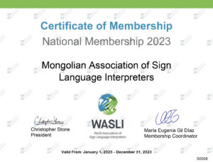 Дэлхийн дохионы хэлний орчуулагчдын холбооны гишүүнчлэлтэй, жил бүр гишүүнчлэлээ баталгаажуулан ажилладаг байгууллага юм.